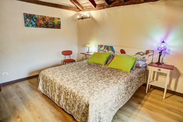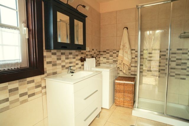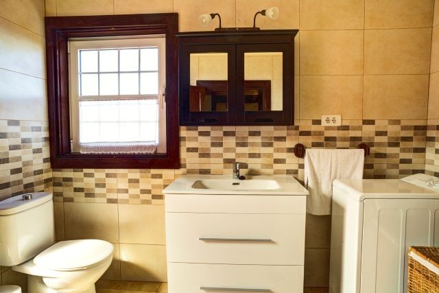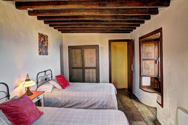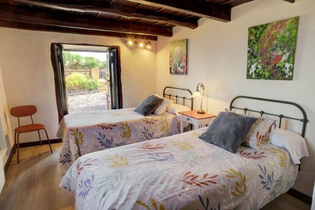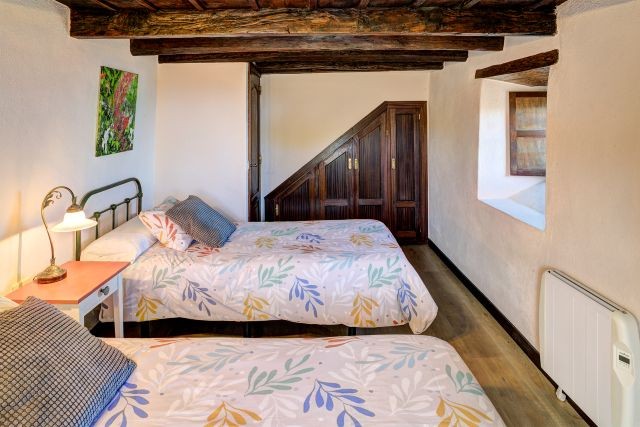 Im Erdgeschoss befindet sich ein Schlafzimmer mit zwei Einzelbetten. Die beiden weiteren Schlafzimmer liegen im ersten Stock: eines mit einem Doppelbett und eines mit zwei Einzelbetten. Das Badezimmer im Erdgeschoss ist mit einer Dusche, Waschbecken, Toilette und einem Föhn ausgestattet; außerdem gibt es eine Waschmaschine sowie ein Bügeleisen mit Bügelbrett.