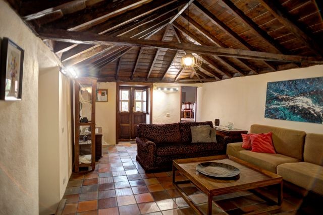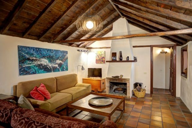Sie erreichen das Haus durch ein Holztor und laufen am benachbarten Casa Sabina vorbei zu den großen Holztüren von Casa Celeste. Sobald Sie eintreten, stehen Sie direkt im Wohnzimmer, einem einladenden Raum mit bequemen Sitzplätzen, Kamin, Fernseher und WLAN. Es ist ein schöner Ort, um nach einem Tag in der Natur zu entspannen.