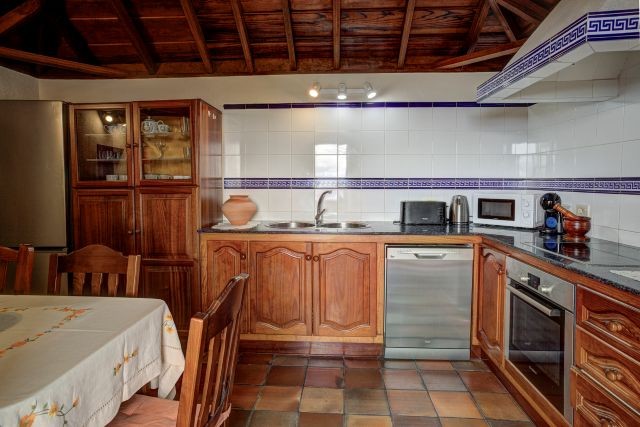 Die Küche mit Essecke ist praktisch und vollständig ausgestattet. Sie finden hier ein elektrisches Vierplattenkochfeld, einen Backofen, eine Mikrowelle, Kühlschrank und Gefrierschrank, Wasserkocher, Toaster, Kaffeemaschine und einen Geschirrspüler. Von der Küche führt eine Tür auf die Terrasse, ideal für ein Frühstück im Freien oder ein Glas Wein in der Abendsonne.