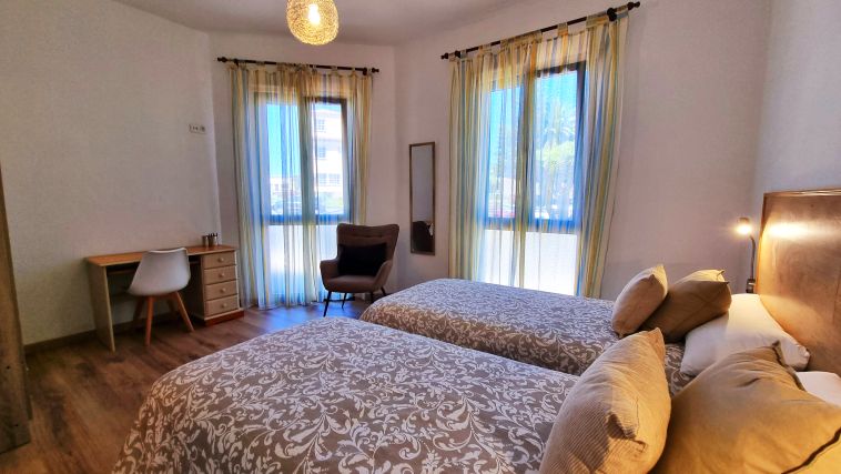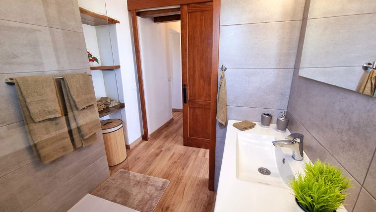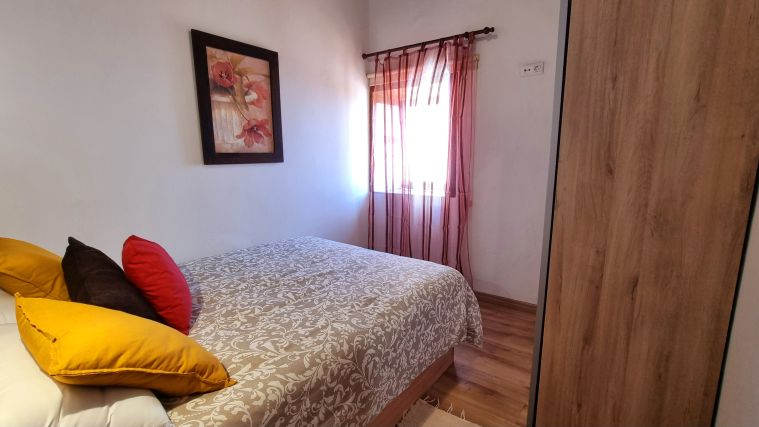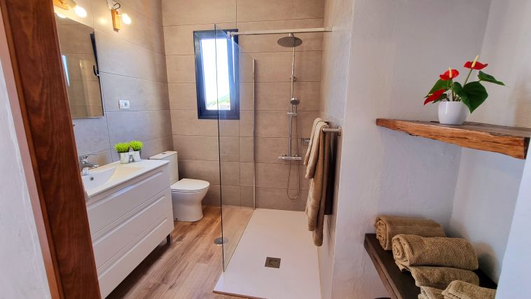 Casa Pirusa verfügt über zwei Schlafzimmer: Das Hauptschlafzimmer an der Straßenseite ist mit einem Doppelbett ausgestattet, während das zweite Schlafzimmer – auf der Rückseite des Hauses – ein Einzelbett hat. Das moderne Badezimmer bietet eine große ebenerdige Dusche, Waschbecken, Toilette und Föhn.