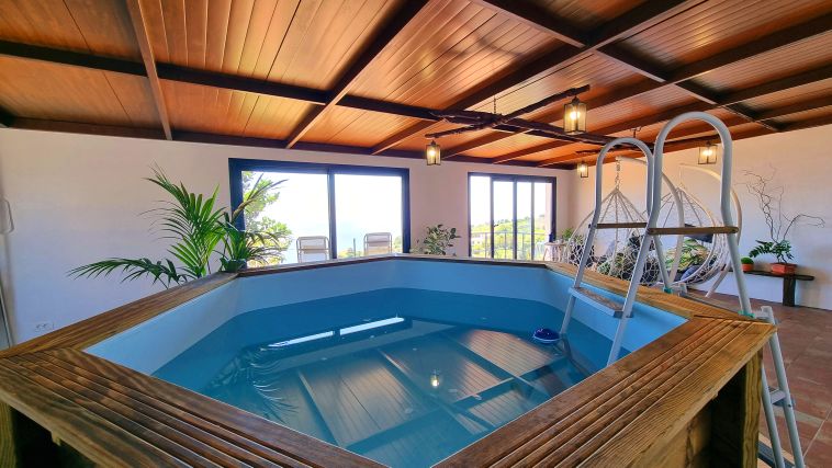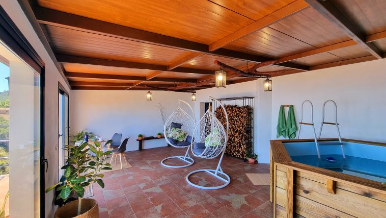 An der Rückseite des Hauses befindet sich eine überdachte Patio mit zwei großen Schiebetüren. Dort finden Sie ein kleines Tauchbecken, zwei Hängesessel und ein Heimtrainer – ein wunderbarer Ort zum Entspannen, auch an kühleren Tagen. Durch die Schiebetür gelangen Sie auf die Terrasse mit Sonnenliegen. Eine Treppe mit fünf Stufen führt hinunter zur zweiten Terrasse, wo sich eine Sitzecke und der eingebaute Grill befinden.