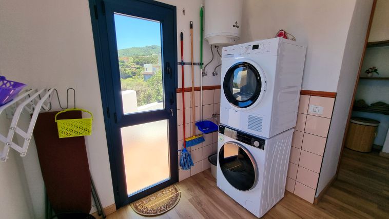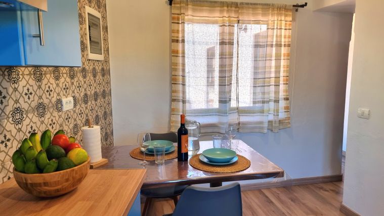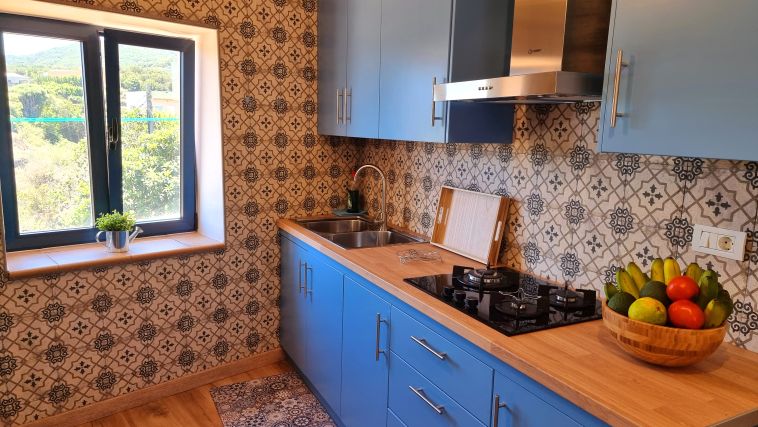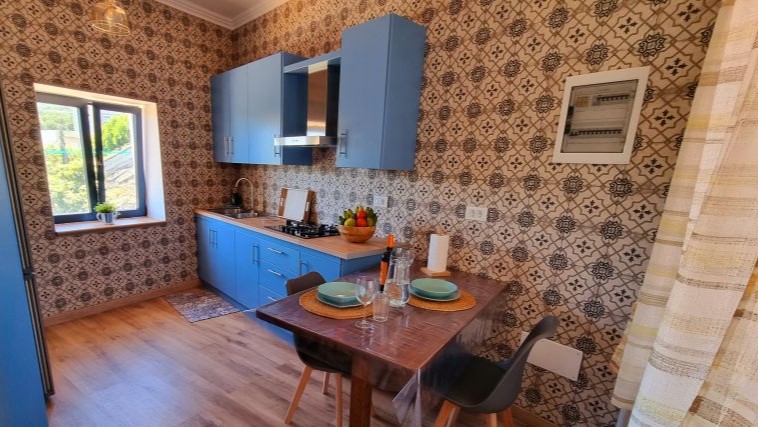 Die Küche wurde vollständig erneuert und ist stilvoll gestaltet, mit blauen Schränken und charakteristischen portugiesischen Fliesen. Sie ist ausgestattet mit einem Gasherd (vier Flammen), elektrischem Ofen, Mikrowelle, Kühlschrank, Kaffeemaschine, Espressomaschine, Toaster, Wasserkocher und Mixer. Im Essbereich steht ein Holztisch mit Stühlen, an dem Sie morgens bei einer Tasse frischem Kaffee den Meerblick genießen können. Auch Waschmaschine und Trockner stehen zur Verfügung.