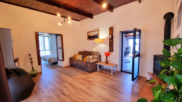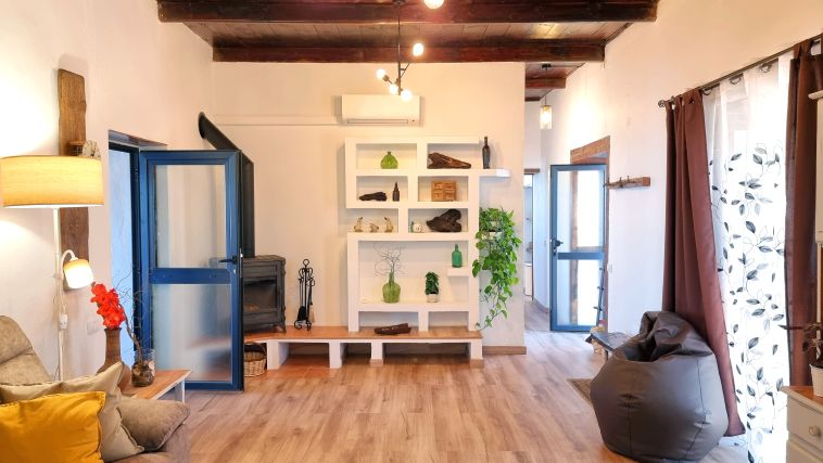 Im Inneren fällt sofort das stimmungsvolle Wohnzimmer auf, mit Holzbalkendecke, warmen Farben und einer gemütlichen Sitzecke am Holzofen. Genügend Brennholz ist vorhanden, um den Ofen an kühleren Abenden anzuzünden. Hier können Sie sich mit einem Buch oder einem Film auf dem Smart-TV entspannen – perfekt nach einem Tag voller Wanderungen und Entdeckungen.