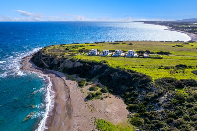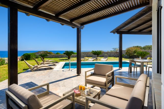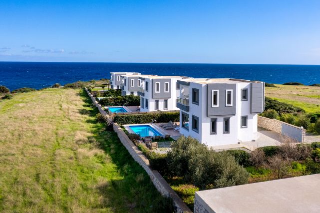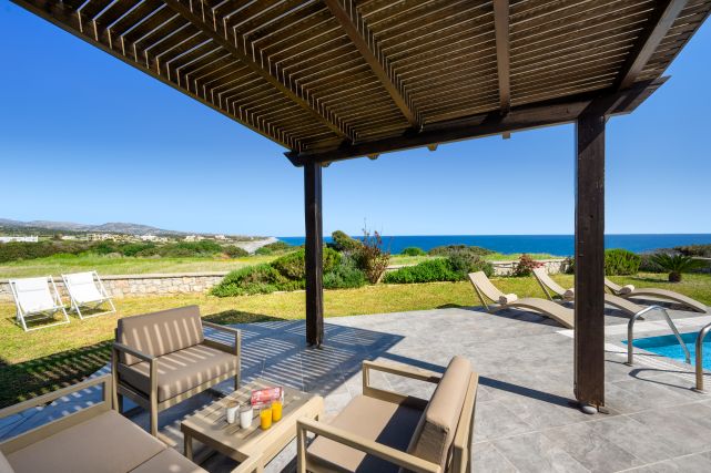 Draußen beginnt das echte Genießen. Jede Villa verfügt über einen eigenen Pool, eine Außendusche und eine großzügige Terrasse mit komfortablen Gartenmöbeln. Der Grill und der Außenessbereich unter der überdachten Terrasse machen das Gesamtbild für lange Sommerabende komplett. Der Strand liegt etwa 120 Meter entfernt und ist über einen direkten Weg nach unten gut erreichbar, sodass Sie immer in der Nähe des Meeres sind, um ein erfrischendes Bad zu nehmen.