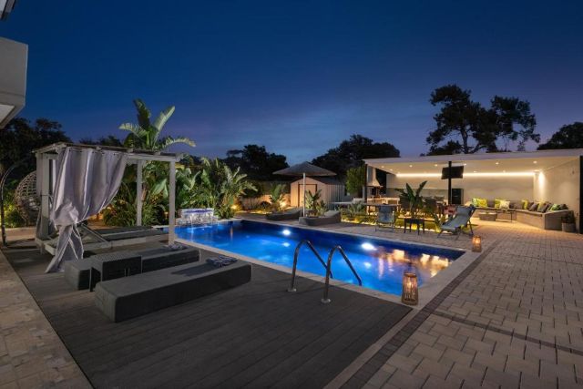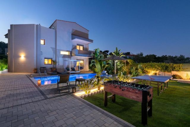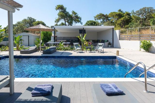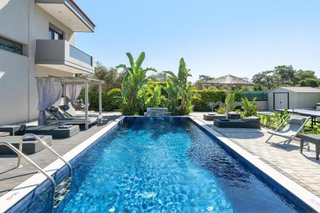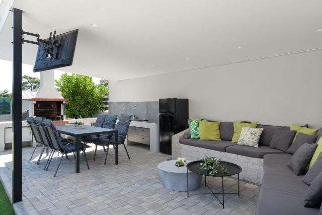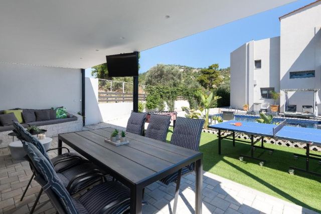 Der überdachte Außenbereich macht diese Villa besonders attraktiv. Hier finden Sie eine komplett ausgestattete Außenküche mit Grill und Kühlschrank, ideal für lange, gemütliche Abende am Esstisch. Für zusätzlichen Spaß sorgen die Tischtennisplatte und der Tischfußball, geeignet für Jung und Alt.