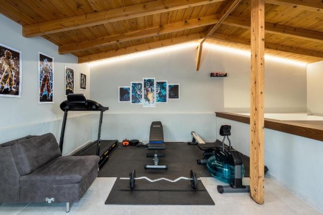 Ein schönes Extra ist das Dachgeschoss, in dem Sie sich sportlich betätigen können, mit Fitnessgeräten wie Laufband, Heimtrainer und Gewichten. So bleiben Sie auch im Urlaub aktiv – mit Blick auf die grüne Landschaft. Außerdem finden Sie hier praktische Einrichtungen wie eine Waschmaschine, einen Trockner, ein Bügelbrett und ein Bügeleisen.