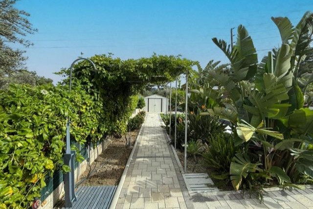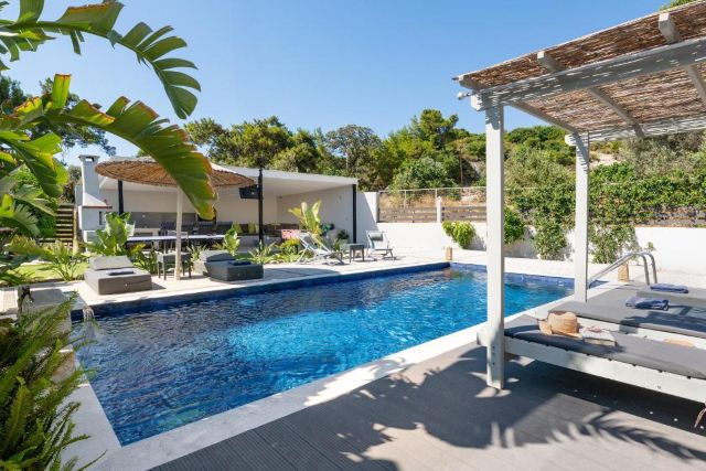 Auch draußen lässt es sich hier ebenso angenehm leben wie drinnen. Im Garten befindet sich der private Pool, umgeben von Liegen, auf denen Sie in aller Ruhe die Sonne genießen können. Die grüne Umgebung und der freie Ausblick sorgen für eine entspannte Atmosphäre. Nach einem erfrischenden Bad können Sie sich ganz einfach unter der Außendusche abspülen.