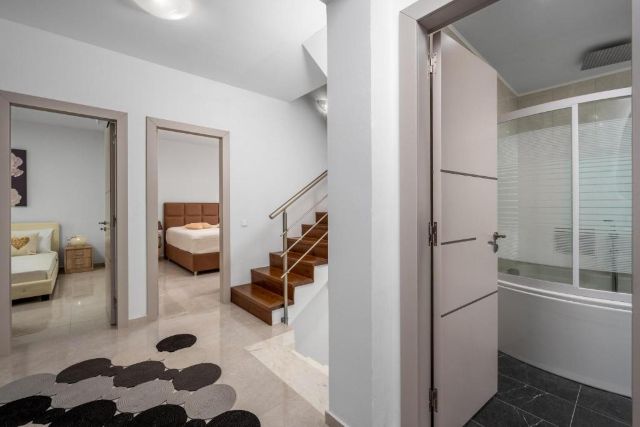 Alle Schlafzimmer befinden sich im ersten Stock und verfügen über Klimaanlage und einen Balkon. Das Hauptschlafzimmer ist mit einem Doppelbett ausgestattet und verfügt über ein eigenes Badezimmer mit Dusche, Toilette, Waschbecken und Föhn. Die beiden anderen Schlafzimmer sind ebenfalls mit einem Doppelbett eingerichtet und teilen sich das zweite Badezimmer mit Badewanne und Dusche, Toilette und Waschbecken. Zusätzlich gibt es noch eine separate Toilette im Erdgeschoss.
