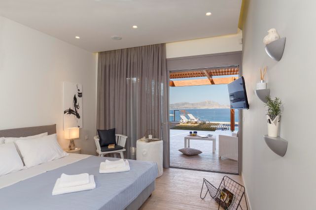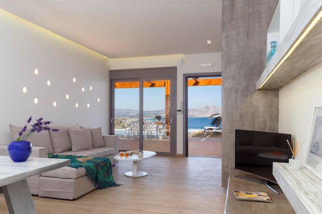 Die Villa Lindia Athena für sechs Personen verfügt über ein Wohnzimmer, das hell und komfortabel eingerichtet ist, mit einer Sitzecke, einem Sofa und einem Fernseher. Dank der großen Flügeltüren gelangen Sie direkt nach draußen, wodurch Innen- und Außenbereich harmonisch ineinander übergehen. Klimaanlage und WLAN sorgen dafür, dass es Ihnen an nichts fehlt.