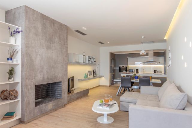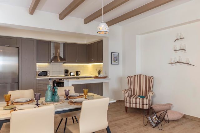 Die offene Küche ist vollständig ausgestattet und bietet allen Komfort. Hier finden Sie unter anderem ein Kochfeld, einen Backofen, einen Kühlschrank mit Gefrierfach, eine Spülmaschine und eine Espressomaschine. Am Esstisch ist ausreichend Platz, um gemeinsam zu essen – sowohl drinnen als auch draußen.