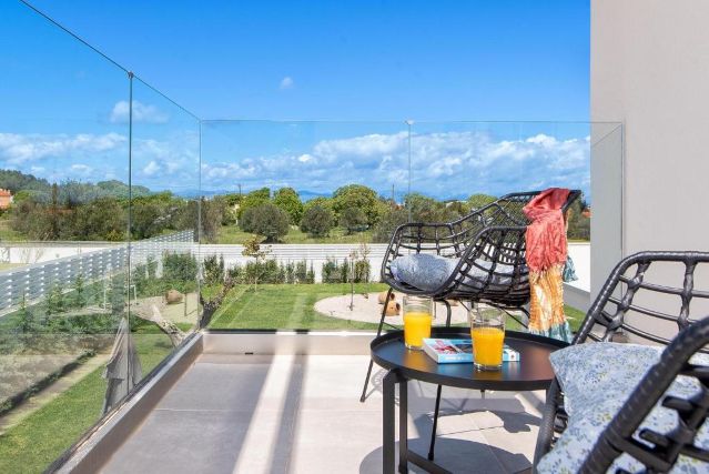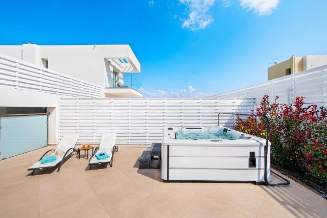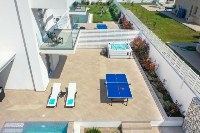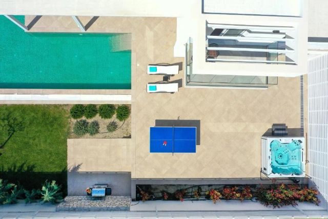 Draußen finden Sie einen großzügigen Garten mit einem beheizten privaten Pool und bequemen Liegen, auf denen Sie herrlich in der Sonne entspannen können. Der Whirlpool sorgt für zusätzliche Entspannung nach einem Tag auf der Insel. Auf der Terrasse mit Grill und Sitzbereich können Sie gemeinsam lange, gemütliche Abende im Freien genießen. Für zusätzliche Unterhaltung steht auch eine Tischtennisplatte bereit.