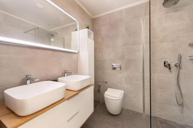 Im ersten Stock liegen zwei weitere Schlafzimmer mit einem Doppelbett und einem Kleiderschrank. Von diesen Zimmern aus haben Sie Zugang zu einem Balkon. Auf dieser Etage befindet sich ebenfalls ein Badezimmer mit Dusche, Waschbecken und Toilette.