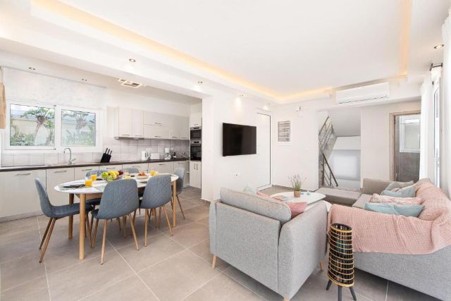 Das Wohnzimmer mit Klimaanlage bildet den zentralen Punkt der Villa. Hier finden Sie eine komfortable Sitzecke, in der Sie nach einem Ausflugstag gemeinsam entspannen können. Mit dem Smart-TV und WLAN können Sie hier auch in Ruhe einen Film schauen oder kurz Ihre E-Mails checken. Die offene Küche ist vollständig ausgestattet und verfügt unter anderem über ein Kochfeld, einen Ofen, eine Mikrowelle, einen Kühlschrank mit Gefrierfach, eine Spülmaschine, eine Espressomaschine, einen Wasserkocher und einen Mixer. Am Esstisch können Sie gemeinsam frühstücken oder ausgiebig zu Abend essen.