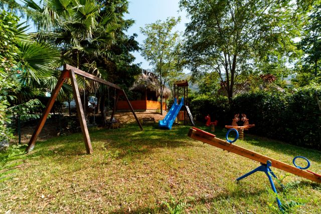 Das separate Badezimmer verfügt über eine Dusche, Waschbecken, Toilette, Föhn und einen Kosmetikspiegel. Das Zimmer bietet Blick auf den Garten.