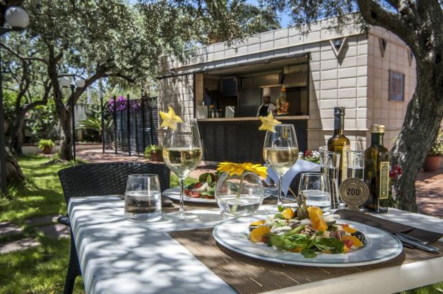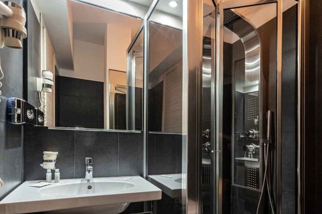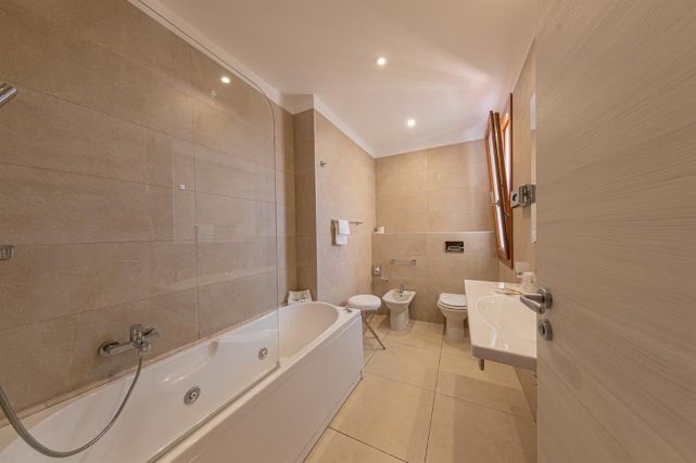 Das Badezimmer ist mit einer Dusche oder Badewanne, Waschbecken, Bidet und Toilette ausgestattet. Außerdem sind ein Haartrockner und Toilettenartikel vorhanden, sodass es Ihnen während Ihres Aufenthalts an nichts fehlt. Angenehmes Tageslicht fällt in das Zimmer und Sie blicken auf den Garten des Hotels, was für eine ruhige und entspannte Atmosphäre sorgt. Dieses Zimmer verfügt nicht über einen Balkon.