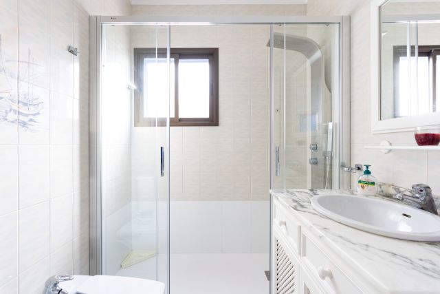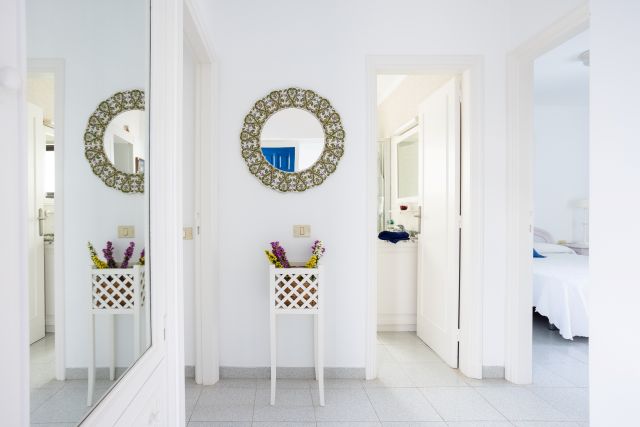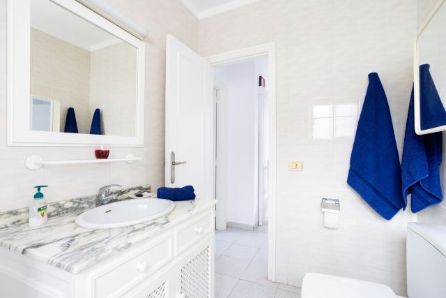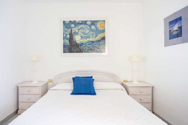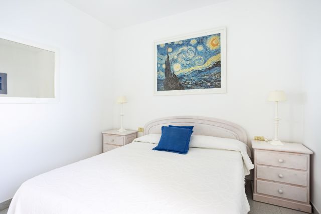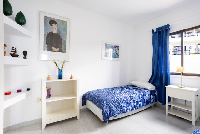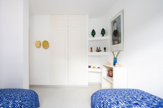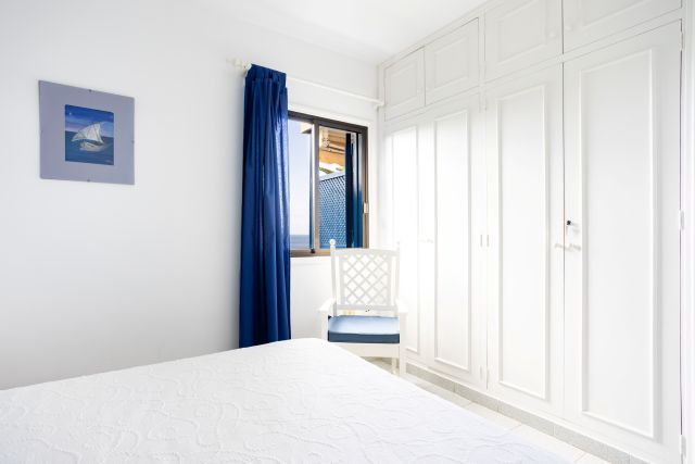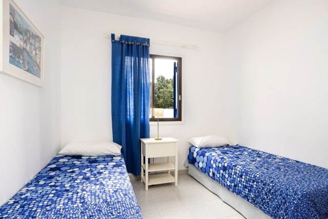 Das Hauptschlafzimmer ist hell und stimmungsvoll, mit einem komfortablen Doppelbett, einem Kleiderschrank und einem Fenster mit Meerblick. Das zweite Schlafzimmer verfügt über zwei Einzelbetten, ebenfalls einen Kleiderschrank, und ist im gleichen frischen Stil mit blauen Akzenten und viel Tageslicht gestaltet. Das Badezimmer ist modern und gepflegt, mit Dusche, Waschbecken, Toilette und Bidet.