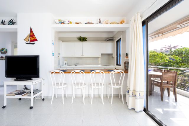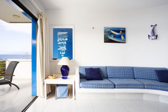 Das Apartment La Arena vermittelt sofort ein angenehmes Gefühl: hell, gepflegt und mit einer entspannten Urlaubsatmosphäre, geeignet für maximal 2 Erwachsene und 2 Kinder. Das Apartment befindet sich im ersten Stock. Das Wohnzimmer ist geräumig und frisch in Weiß-Blau-Tönen eingerichtet, mit einer komfortablen Sitzecke, einem Fernseher und viel natürlichem Licht dank der großen Schiebetür zum Balkon. Maritime Details und persönliche Akzente sorgen für eine wohnliche, sonnige Atmosphäre.