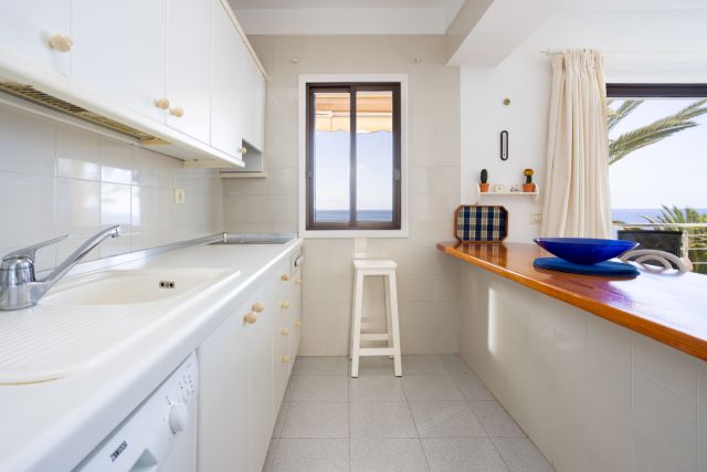 Die offene Küche fügt sich harmonisch an das Wohnzimmer an und verfügt über eine Theke mit Barhockern und Meerblick. Sie ist vollständig ausgestattet mit Kochfeld, Kühlschrank, Mikrowelle, Kaffeemaschine, Wasserkocher, Toaster und Geschirrspüler, ideal für alle, die im Urlaub gerne selbst kochen. Es gibt auch eine Waschmaschine sowie ein Bügelbrett mit Bügeleisen.