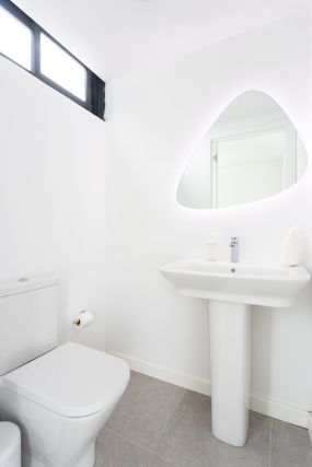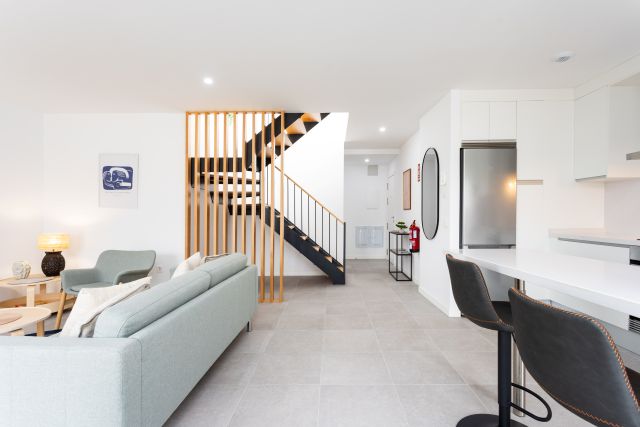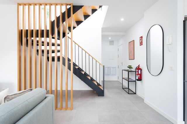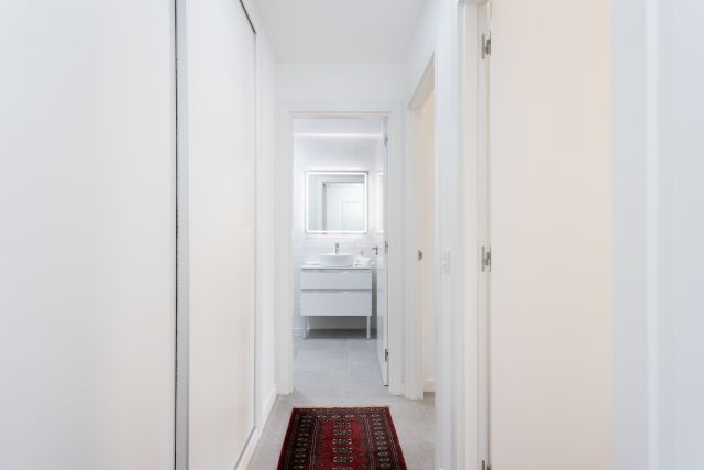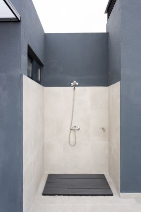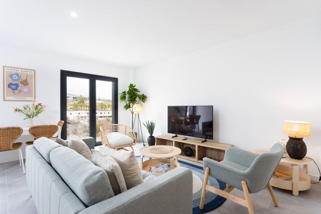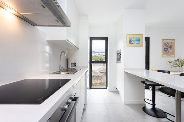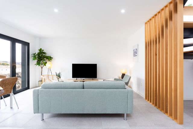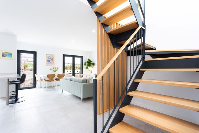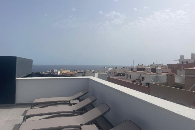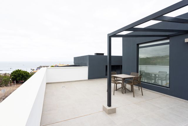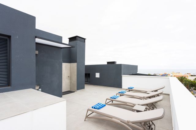 Vom Wohnzimmer führt eine Treppe in die zweite Etage, wo sich ein zusätzliches WC und die großzügige private Dachterrasse von etwa 70 m² befinden – eines der größten Highlights dieses Apartments. Hier gibt es Liegestühle, eine Außendusche, einen Tisch mit Stühlen und zwei Hängematten für eine entspannte Siesta. Dank des Ausblicks ist dies ein wunderbarer Ort, um die Sonne zu genießen oder den Abend gemütlich draußen zu verbringen.