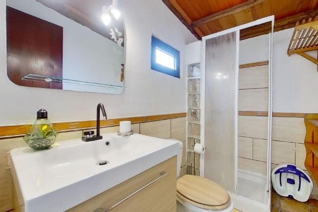 Das Wohnzimmer ist praktisch und gemütlich eingerichtet, mit einer Sitzecke, Fernseher und WLAN. Es gibt ausreichend Platz, um sich zu entspannen oder gemeinsam zu essen. Die offene Küche ist komplett ausgestattet, unter anderem mit Kochfeld, Kühlschrank, Mikrowelle, Kaffeemaschine, Wasserkocher und Toaster. Außerdem gibt es einen Esstisch, sodass Sie ganz einfach Ihre eigenen Mahlzeiten zubereiten können, genau dann, wenn es Ihnen passt.