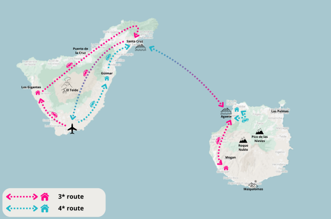 Nach Ihrer Ankunft am Flughafen Teneriffa Süd nehmen Sie den Mietwagen in Empfang und fahren in eigener Regie zu Ihrem Hotel. Diese Inselhopping-Reise ist mit Übernachtung in komfortablen 3*- oder 4*-Hotels buchbar, wie im Abschnitt Zimmertypen beschrieben.